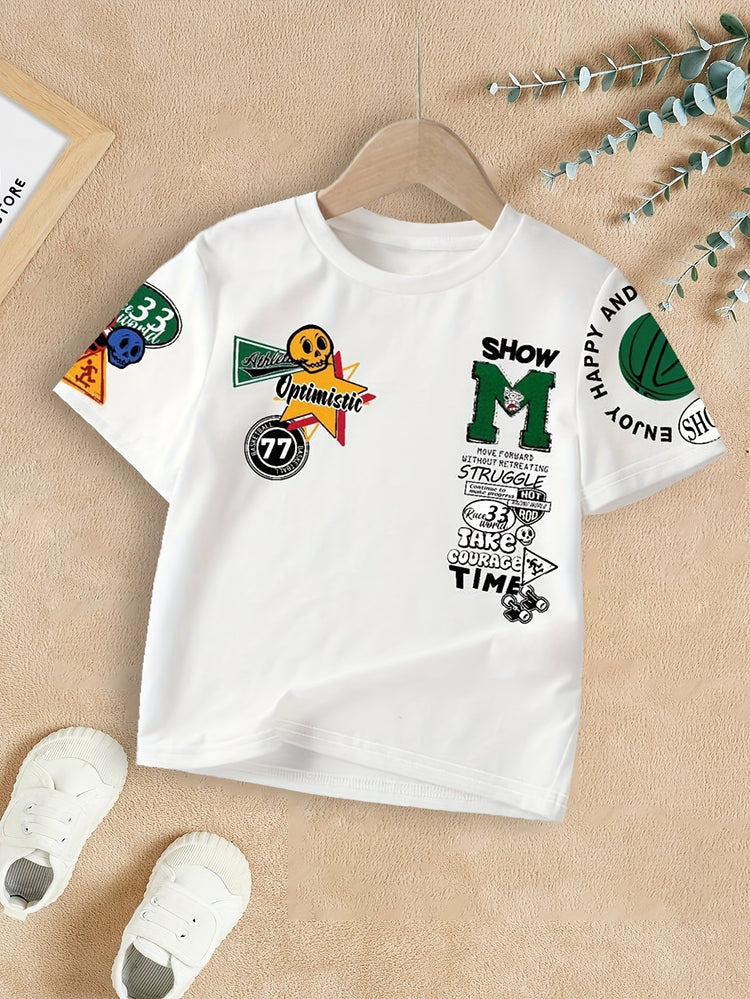 T-shirt d'été blanc tendance pour garçon avec imprimé lettres tendance, col ras du cou