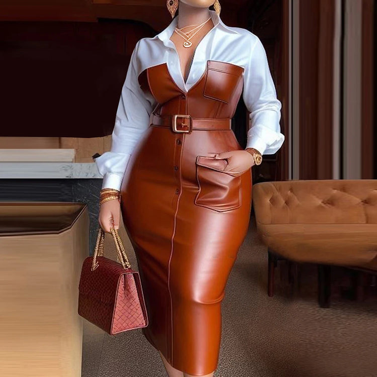 Women Elegant Pu Leather Shirt Dress Patchwork Lapel Collar Belt Summer Bodycon Pocket Single Breasted Long Sleeve Female Dresses