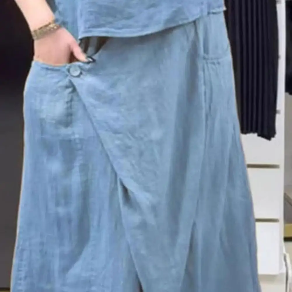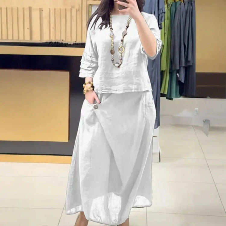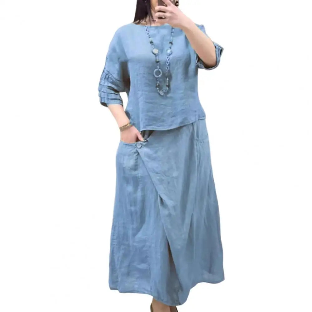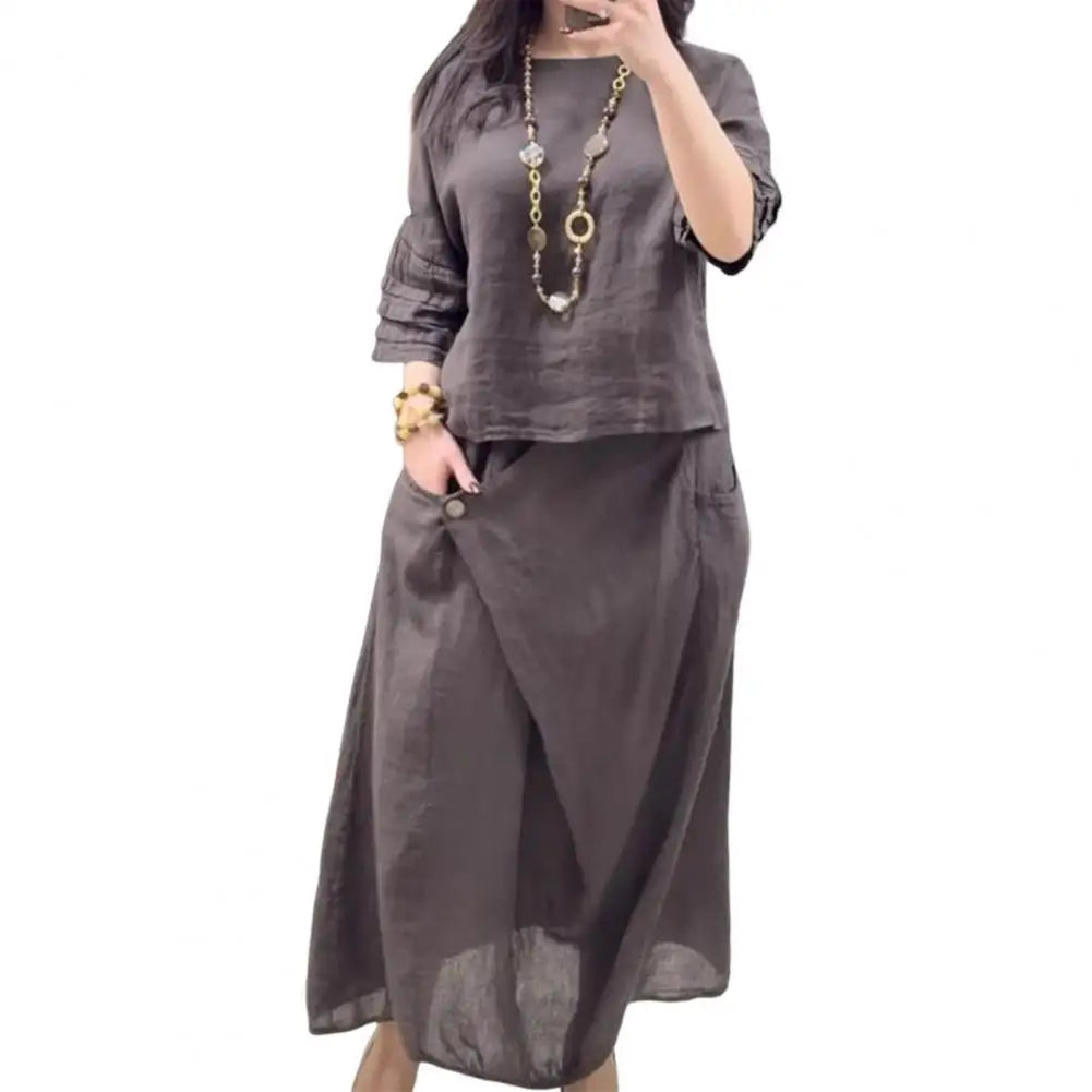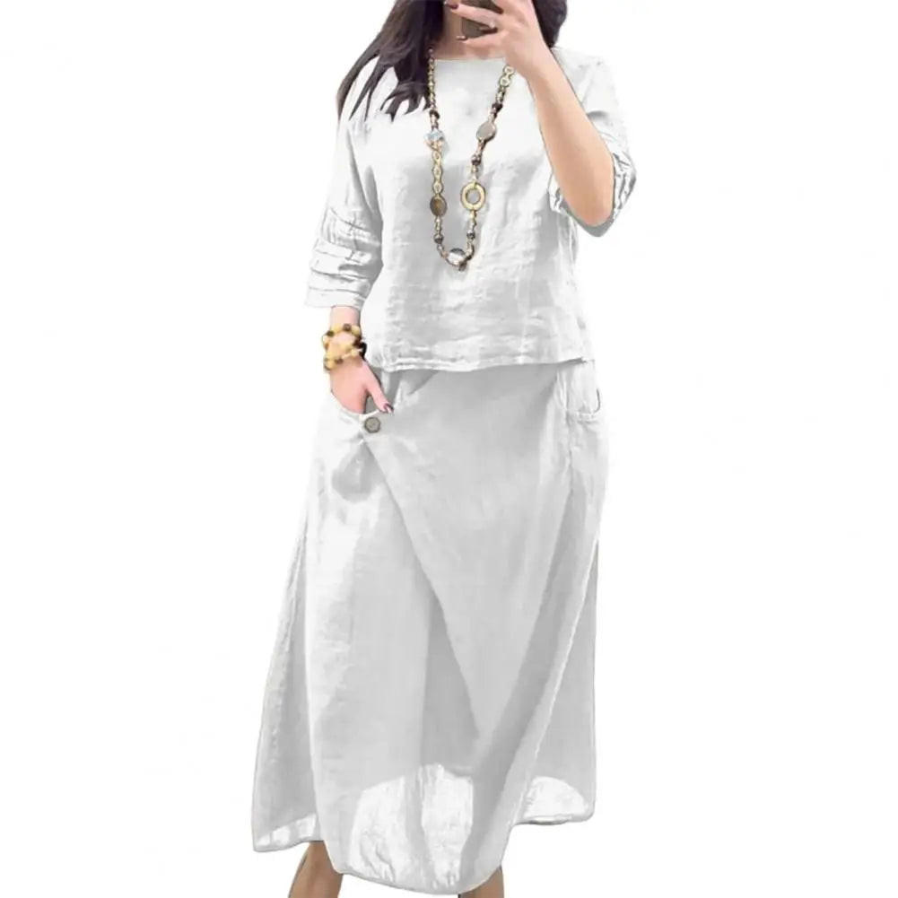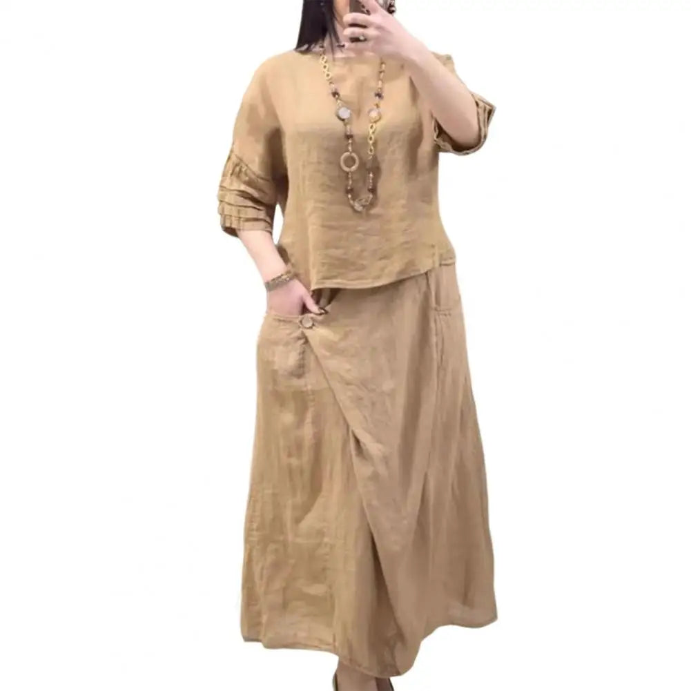 Women Linen Two Piece Set Summer Outfit Short Sleeve Top Midi Skirt Elegant 2 Piece Lounge Set for Ladies
