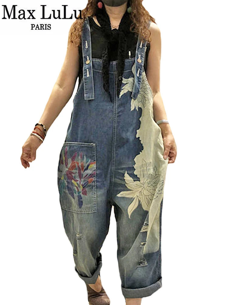 Women's Plus Size Vintage Casual Printed Denim Overalls
