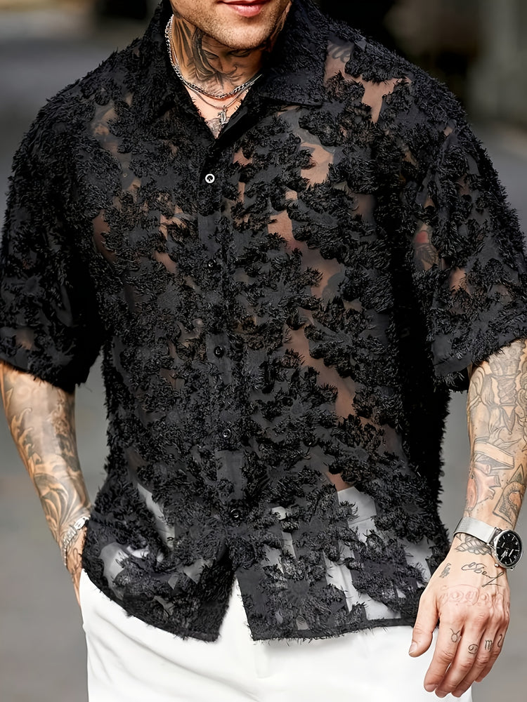 Chemise à lacets semi-transparente style bohème chic pour homme, motif floral noir à imprimé marguerites